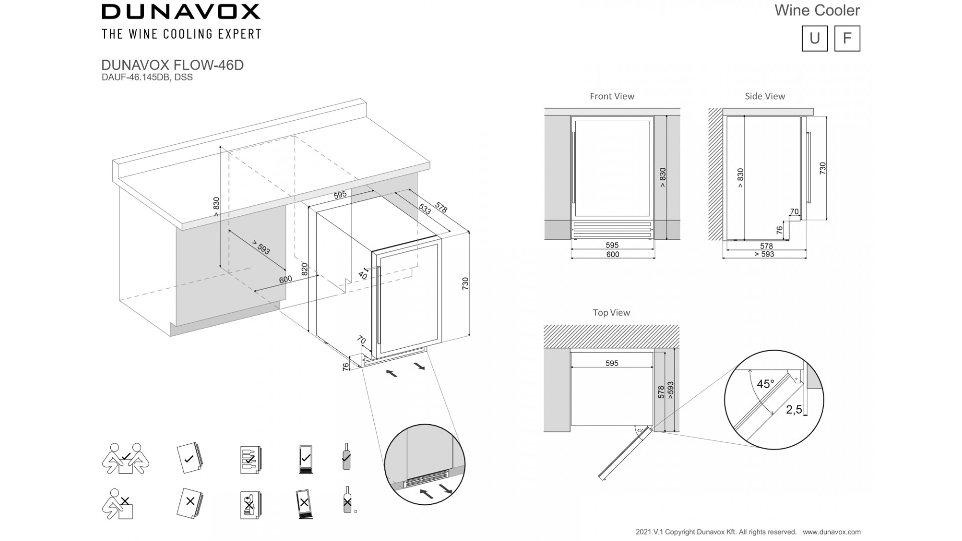 Модель DAUF-46.145DB как встраиваемая, так и отдельностоящяя. Установить ее можно под столешницу Вашего мебельного гарнитура. Ножки регулируются под нужную высоту. Модель идеально вписывается в любой подходящий для Вас интерьер гостиной кухни, бара или кабинета.