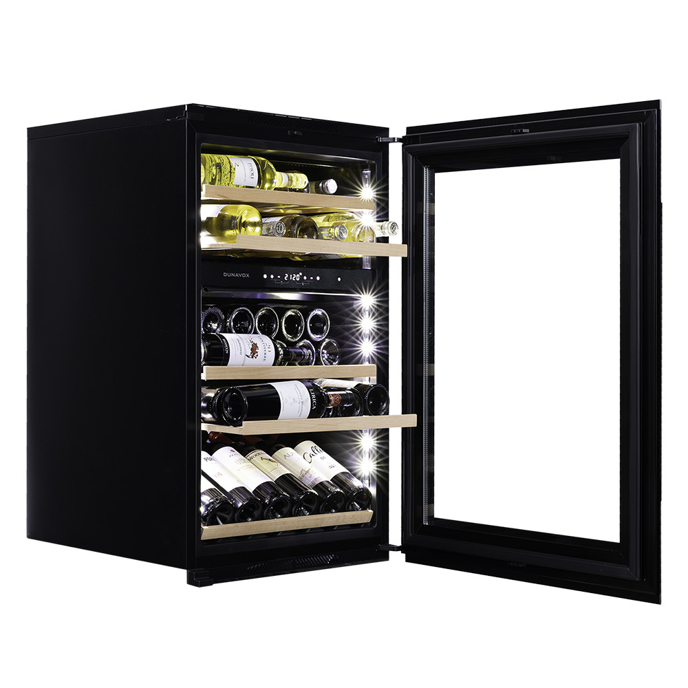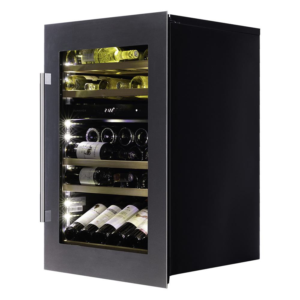 После установки дверь открывается с помощью ручки из бесшовной нержавеющей стали. В качестве дополнительной функции, производители Dunavox разработали реверсивную дверь. Это поможет разместить шкаф в удобном для Вас месте или расположить две модели рядом, создав технологию открытия side-by-side.Тройное стекло с защитой от прямых УФ-лучей поддерживает качественные условия хранения вина. Встроенная система вентиляции создаёт необходимую циркуляцию воздуха для правильной работы винного холодильника.