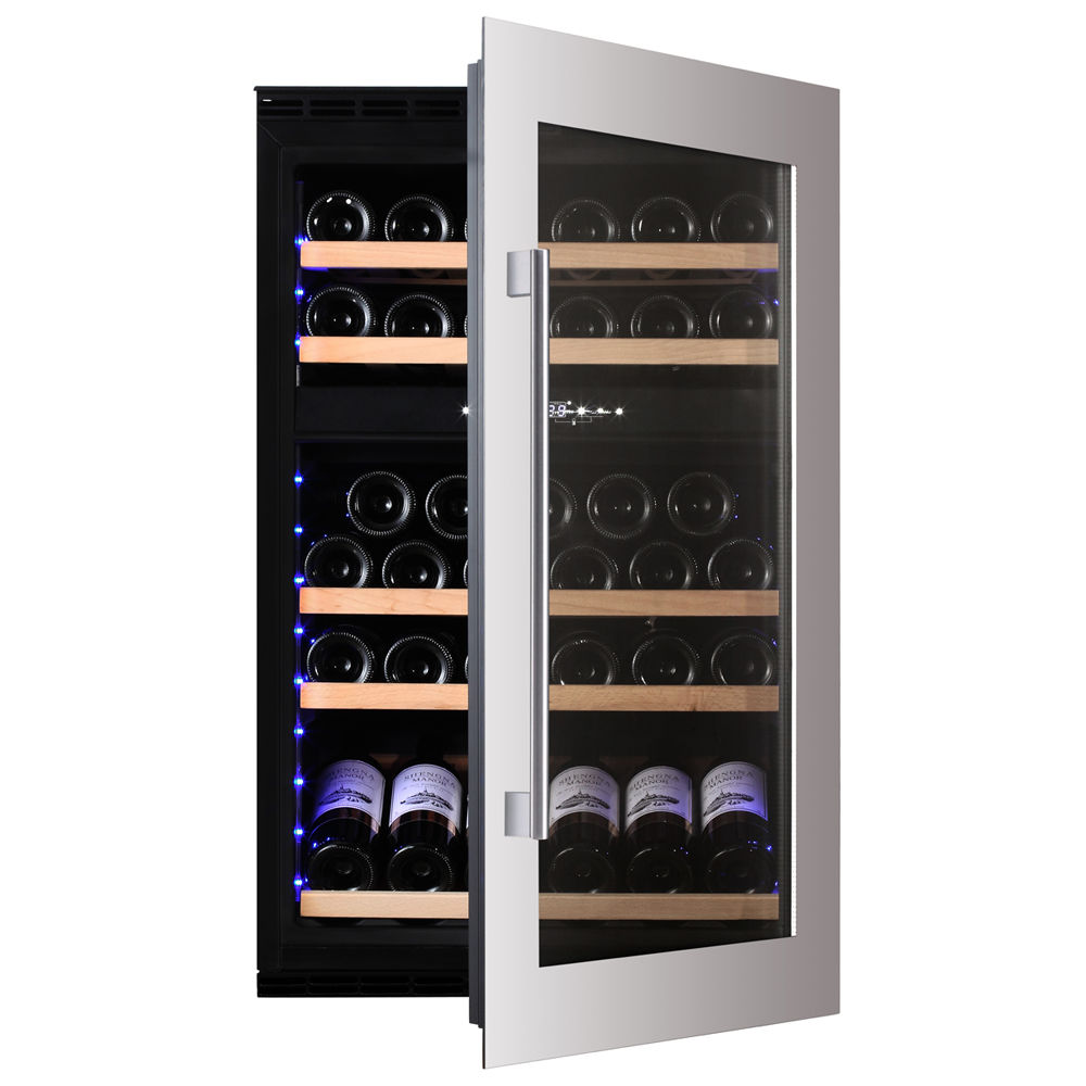 Лаконичный дизайн шкафа придаёт интерьеру современный вид. Чёрный корпус и рамка из бесшовной нержавеющей стали добавляют элегантности и солидности. В этой модели использовано панорамное освещение синего, янтарного и белого цвета, которое обеспечивает равномерную подсветку всех полок. (Освещение плавно включается при открывании дверцы, а через пару секунд после закрытия плавно гаснет.) Дополнительно у данной модели шкафа предусмотрен демонстрационный режим, во время которого освещение не гаснет. Такая функция помогает демонстрировать винную коллекцию Вашим друзьям и близким.