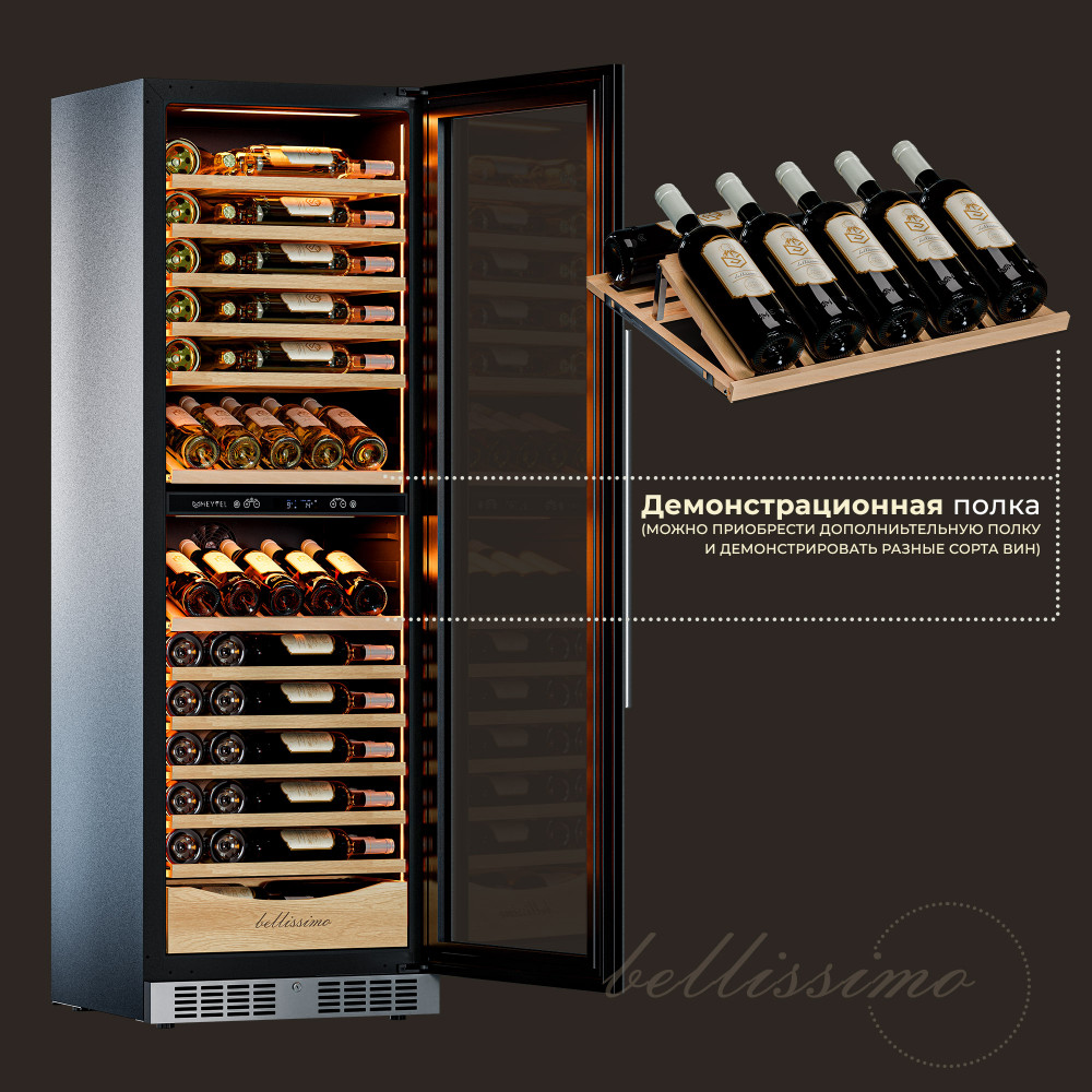 Несомненно, Вас порадует наличие панорамного светодиодного освещения (подсвечивает каждую полку), которое имеет три цвета - белый, янтарный и синий. Оно не выделяет тепло и следовательно - не нагревает бутылки с вином. Так что Вы сможете эффектно демонстрировать Вашу винную коллекцию.