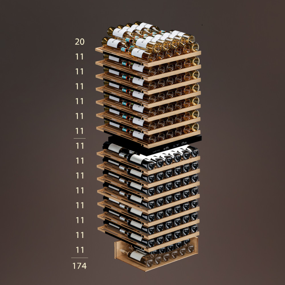 Винный шкаф предназначен для профессионального и длительного хранения различных сортов вин (до 174 бутылок типа Бордо). Он так же оснащен дверью с защитой от ультрафиолетовых лучей и поддерживает влажность в диапазоне 60-80%, как в настоящем винном погребе.