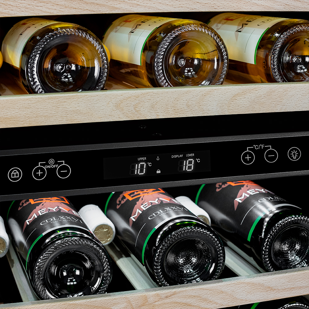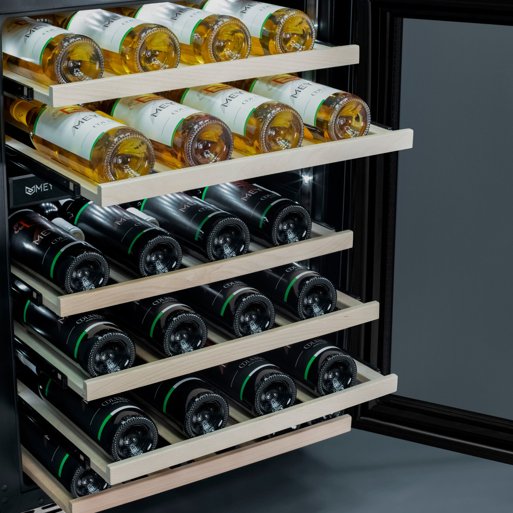 Компрессорный винный шкаф Meyvel MV46PRO-KST2 обладает большой вместимостью и даёт возможность разместить до 46 бутылок стандартного типа Бордо (0,75 л). Располагаются они на выкатных полках из дерева. Внутреннее пространство шкафа разделено на 2 температурные зоны, с возможностью настраивать каждую из них. Диапазон верхней зоны варьируется от +5°C до +12°C, а нижней - от +12°C до +20°C.