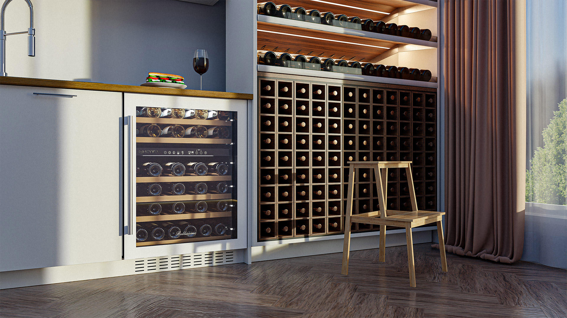 - необходимо установить винный шкаф по уровню и отрегулировать зазоры между дверью и мебельным фасадом, чтобы не повредить их.