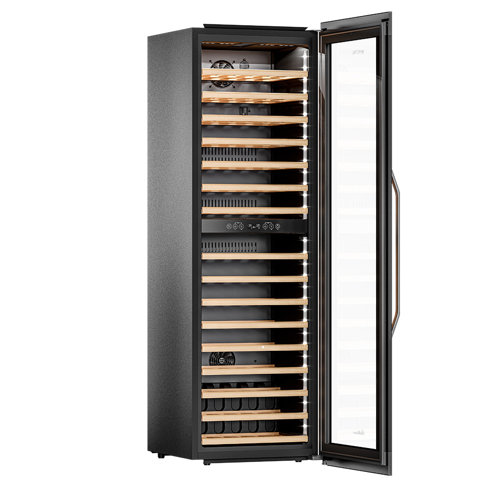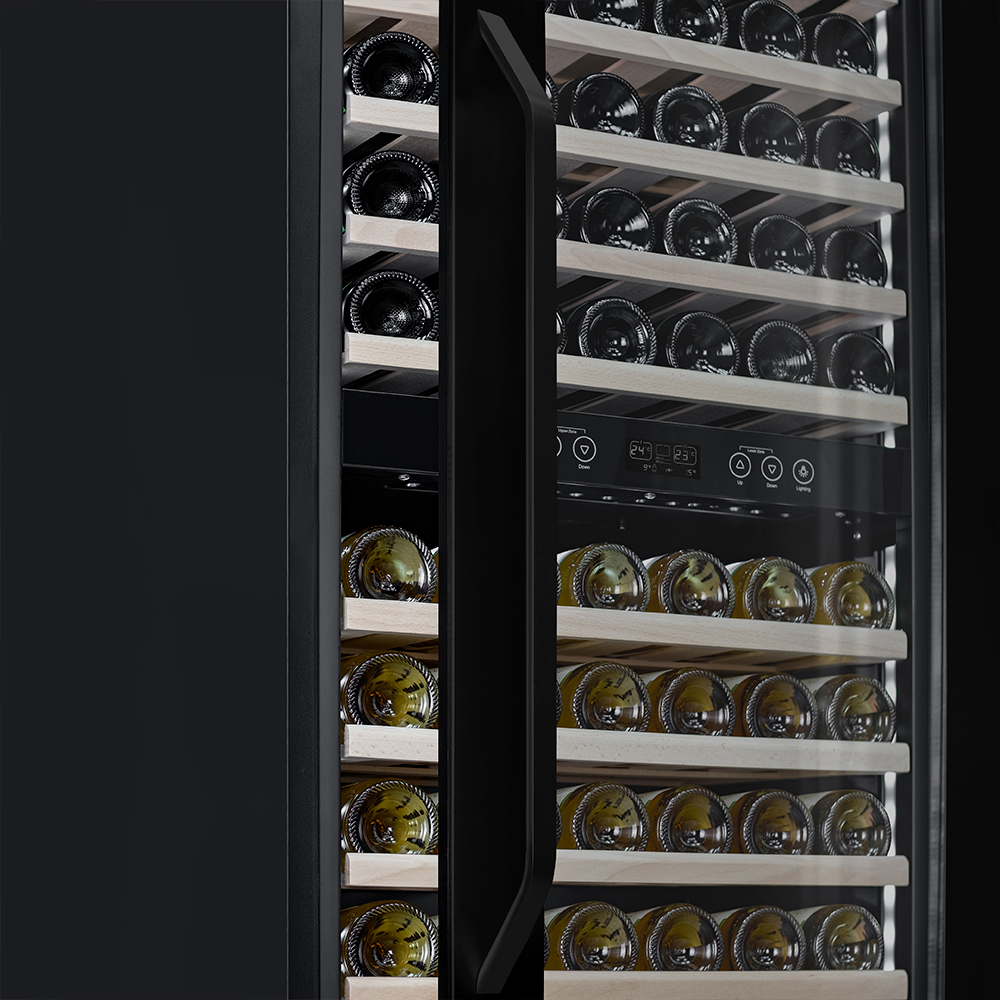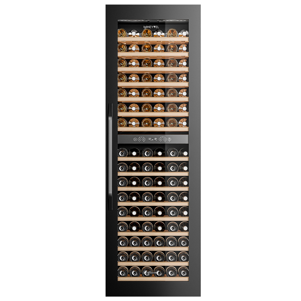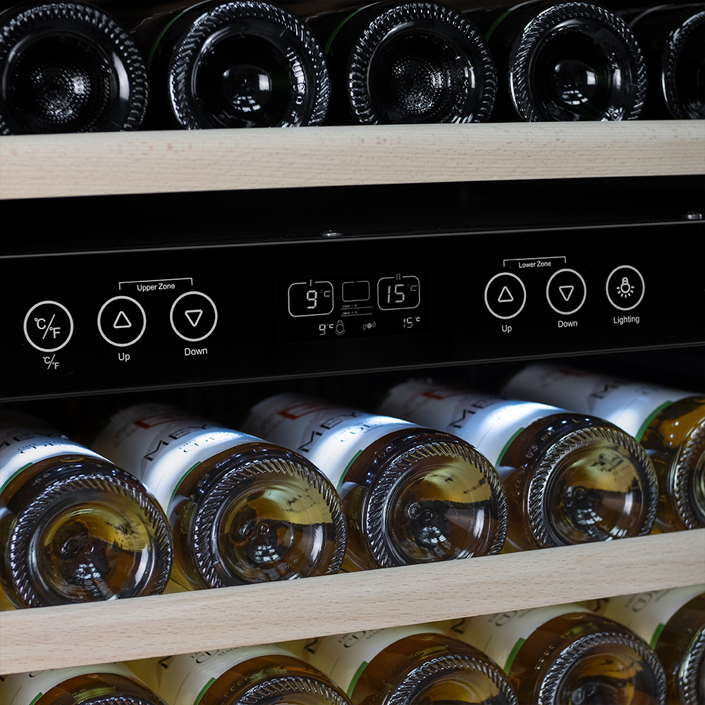 Компрессорный винный шкаф Meyvel MV83-KBB2 обладает большой вместимостью и способен разместить до 96 бутылок. Располагаются они на полках из массива бука. Внутреннее пространство шкафа разделено на 2 температурные зоны с возможностью настраивать каждую из них. Общий температурный диапазон от +5°C до +18°C. Холодильник поддерживает влажность в диапазоне 60-80%, как в настоящем винном погребе.