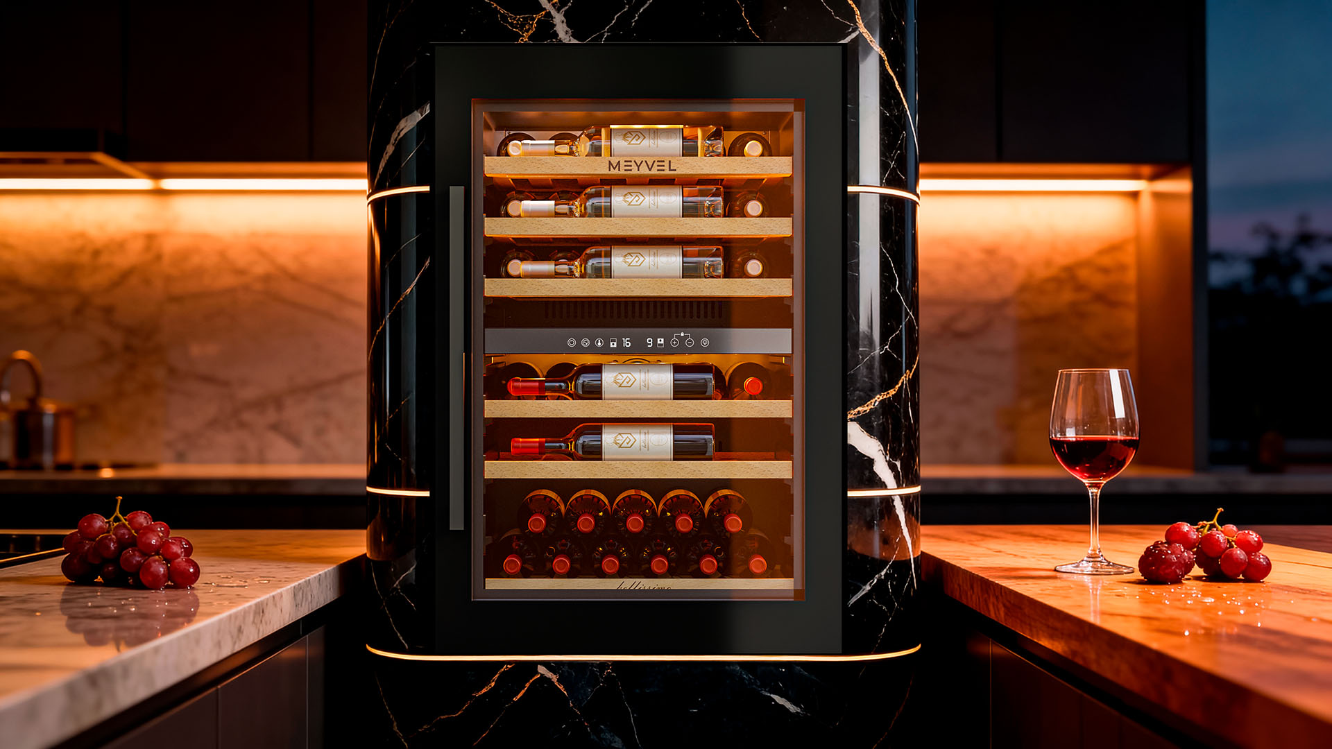 Но эстетика хранения играет не меньшую роль, чем практичность. Модель оснащена подсветкой, которая может быть белой, синей или янтарной. При открывании двери освещение включается автоматически, а также его можно активировать вручную с помощью кнопки на панели. Есть панорамное освещение, которое мягко подсвечивает каждую полку. Свет равномерный и ненавязчивый: он подчёркивает коллекцию, не влияя на условия хранения.