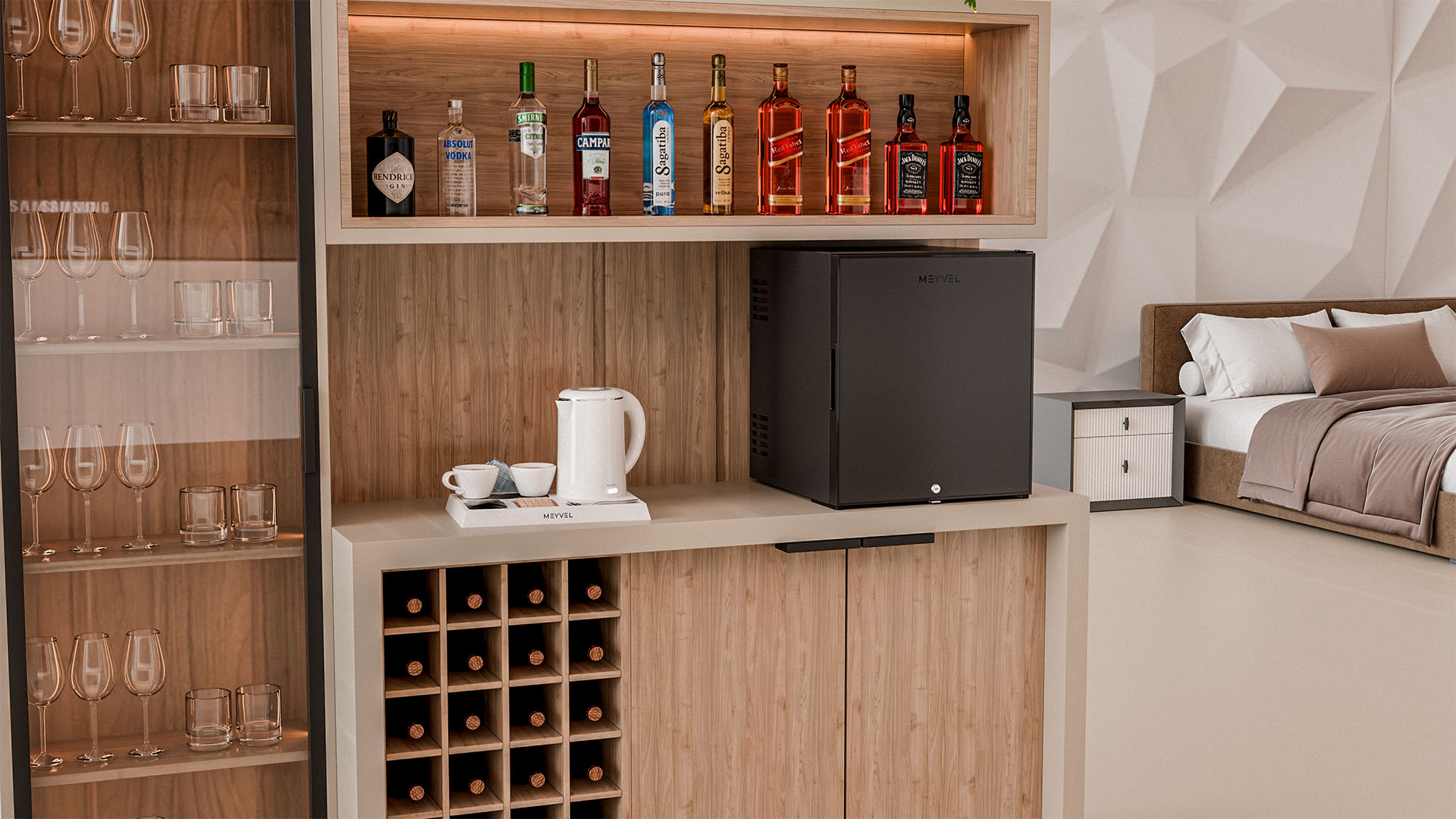 В абсорбционной системе охлаждения отсутствуют движущиеся части, поэтому прибор работает бесшумно, что важно для гостиниц, спален и офисов, где тишина играет важную роль. Мини-бар не создает вибраций и издает неприятных звуков, не нарушая сон или рабочую атмосферу.
