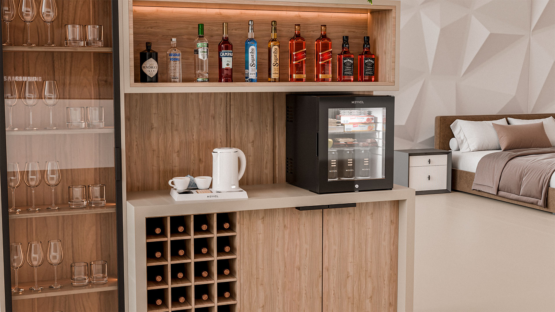 Дополнительным преимуществом является скользящий шарнир, с помощью которого объединяют дверцы мини-бара и мебели, в которую он встраивается. Этот механизм обеспечивает плавное открывание в одно движение и продлевает срок службы как самого устройства, так и мебели.