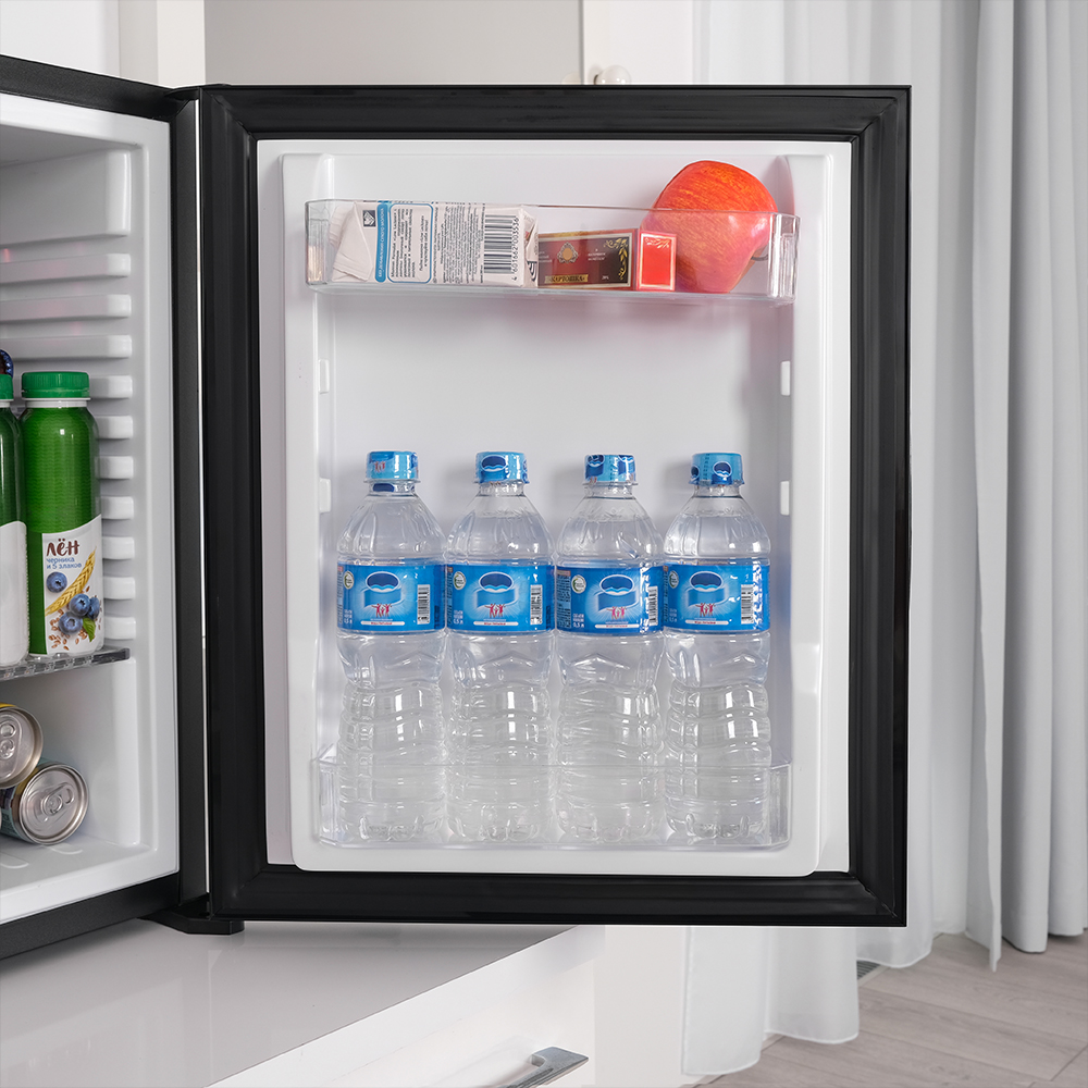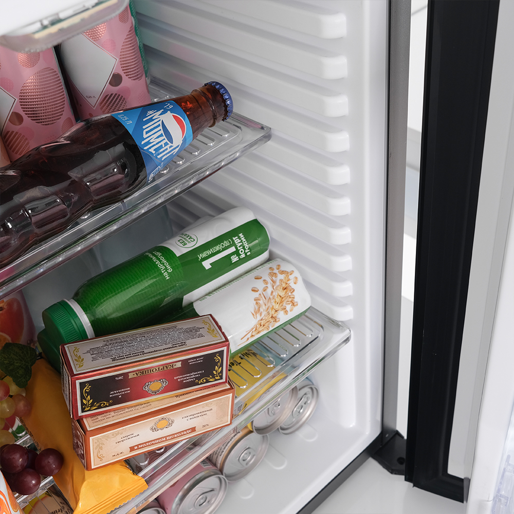 Мини-бар поддерживает температуру от +4°C до +7°C при комнатной температуре 21°C, что идеально подходит для хранения напитков и легких закусок.