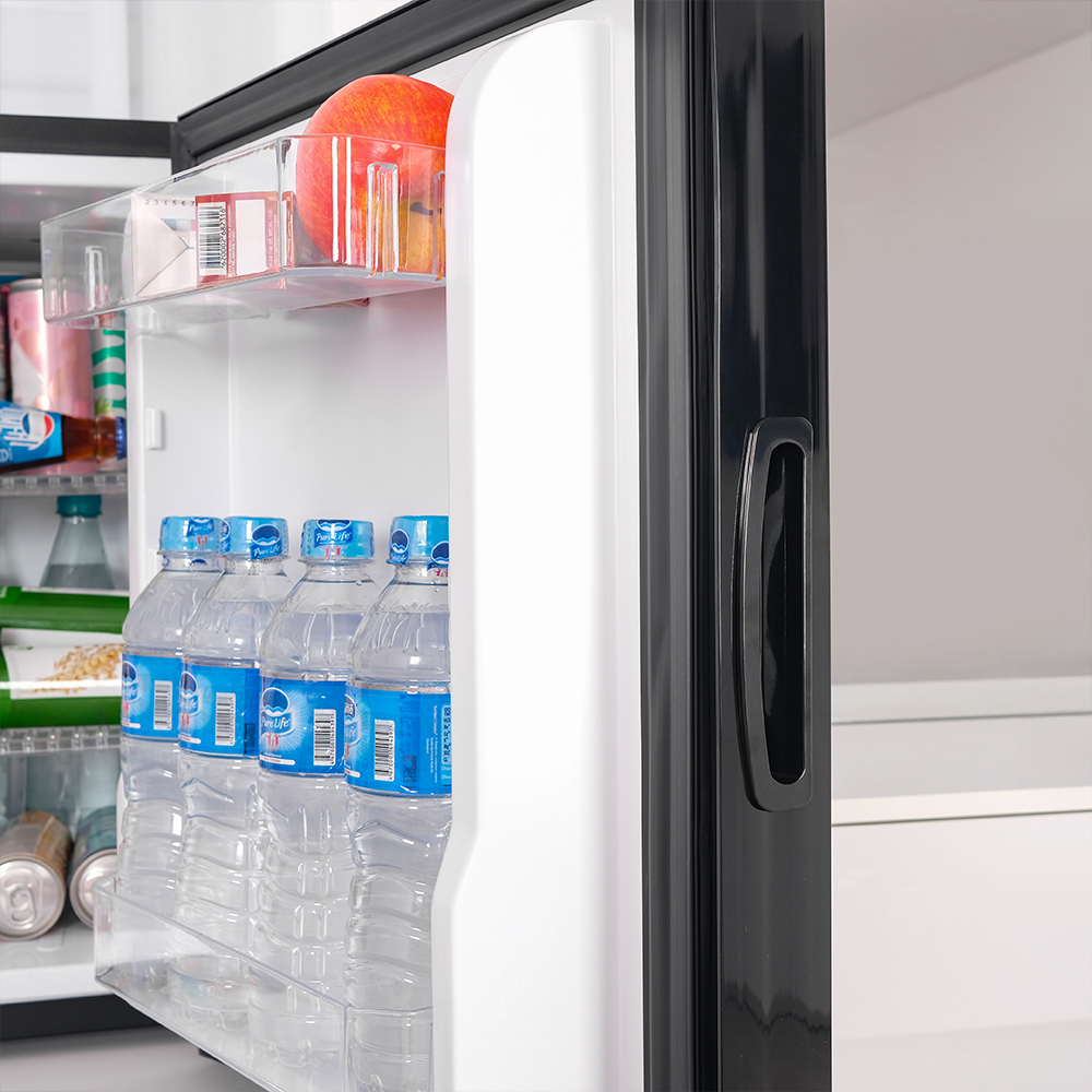 Внутреннее пространство организовано с учетом различных потребностей. На двух основных полках размещаются бутылки и продукты, а дополнительные закуски — в двух дверных секциях (все полки регулируются по высоте). Благодаря внутреннему освещению содержимое хорошо видно даже в темное время суток.