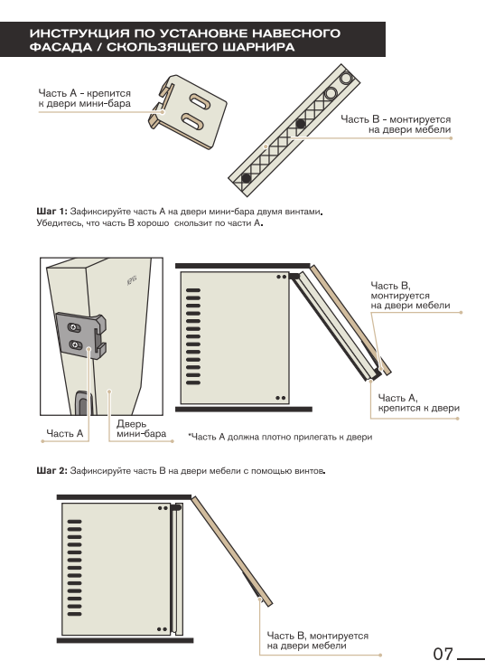 Скользящий шарнир — ключевой элемент встроенного мини-бара. Он обеспечивает плавное движение дверцы, и фасад мебел и дверца холодильника открываются синхронно одним движением. Благодаря этому мини-бар гармонично вписывается в интерьер, а доступ к напиткам становится максимально удобным. Такой механизм повышает комфорт использования и продлевает срок службы техники.