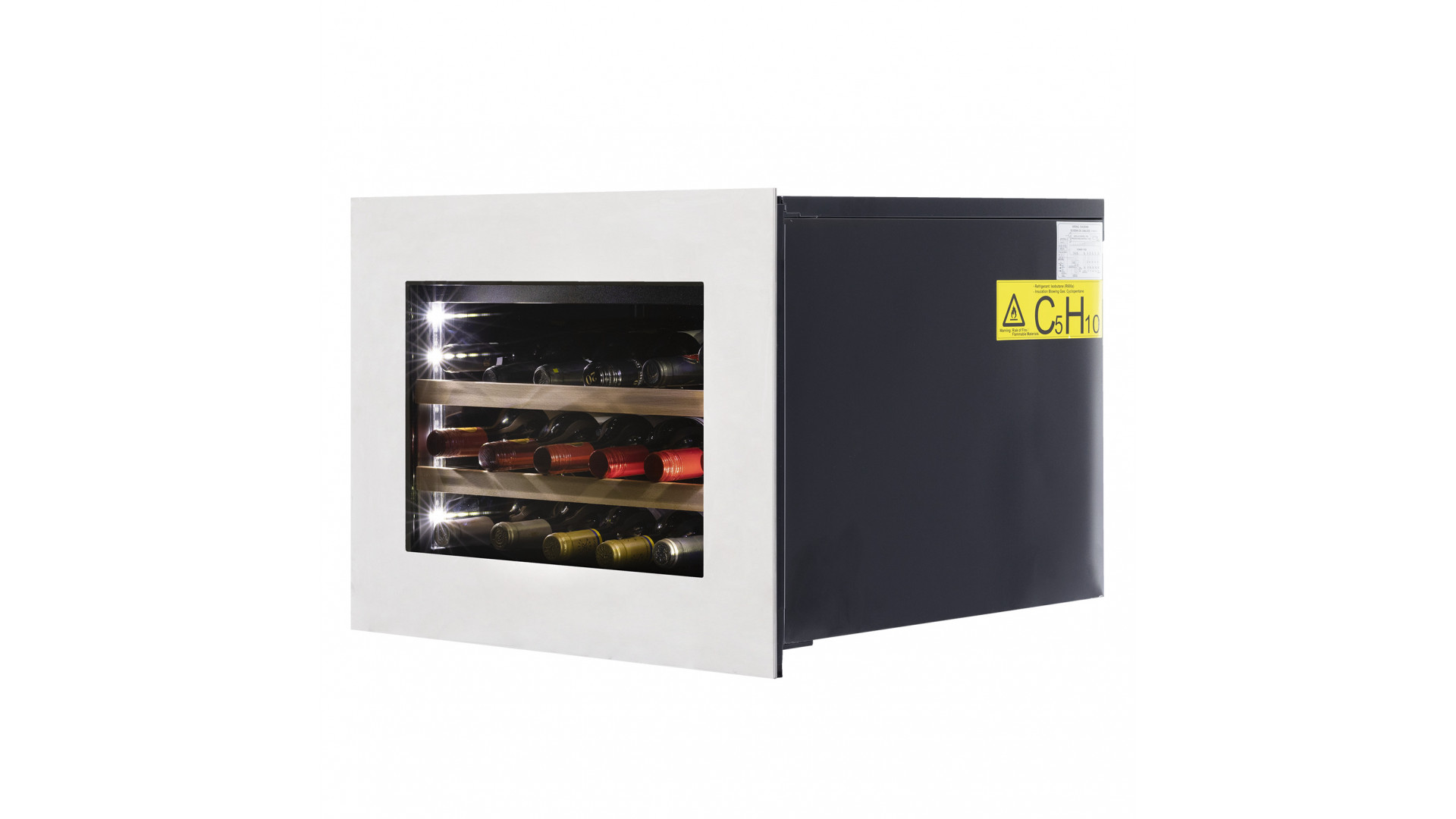 Лаконичный дизайн шкафа придаёт интерьеру современный вид. Чёрный корпус и рамка из бесшовной нержавеющей стали добавляют элегантности и солидности. В этой модели использовано панорамное освещение синего, янтарного и белого цвета, которое обеспечивает равномерную подсветку всех полок. (Освещение плавно включается при открывании дверцы, а через пару секунд после закрытия плавно гаснет.) Дополнительно у данной модели шкафа предусмотрен демонстрационный режим, во время которого освещение не гаснет. Такая функция помогает демонстрировать винную коллекцию Вашим друзьям и близким.
