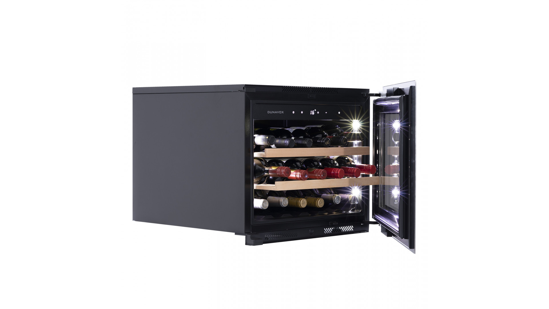 После установки данного винного шкафа сохраняется функция Touch Open. Дверца открывается во время прикосновения Вашей руки к стеклу. При необходимости можно установить ручку из нержавеющей стали и настроить чувствительность сенсора. В качестве дополнительной функции, производители Dunavox разработали реверсивную дверь. Это поможет разместить шкаф в удобном для Вас месте или расположить две модели рядом, создав технологию открытия side-by-side.