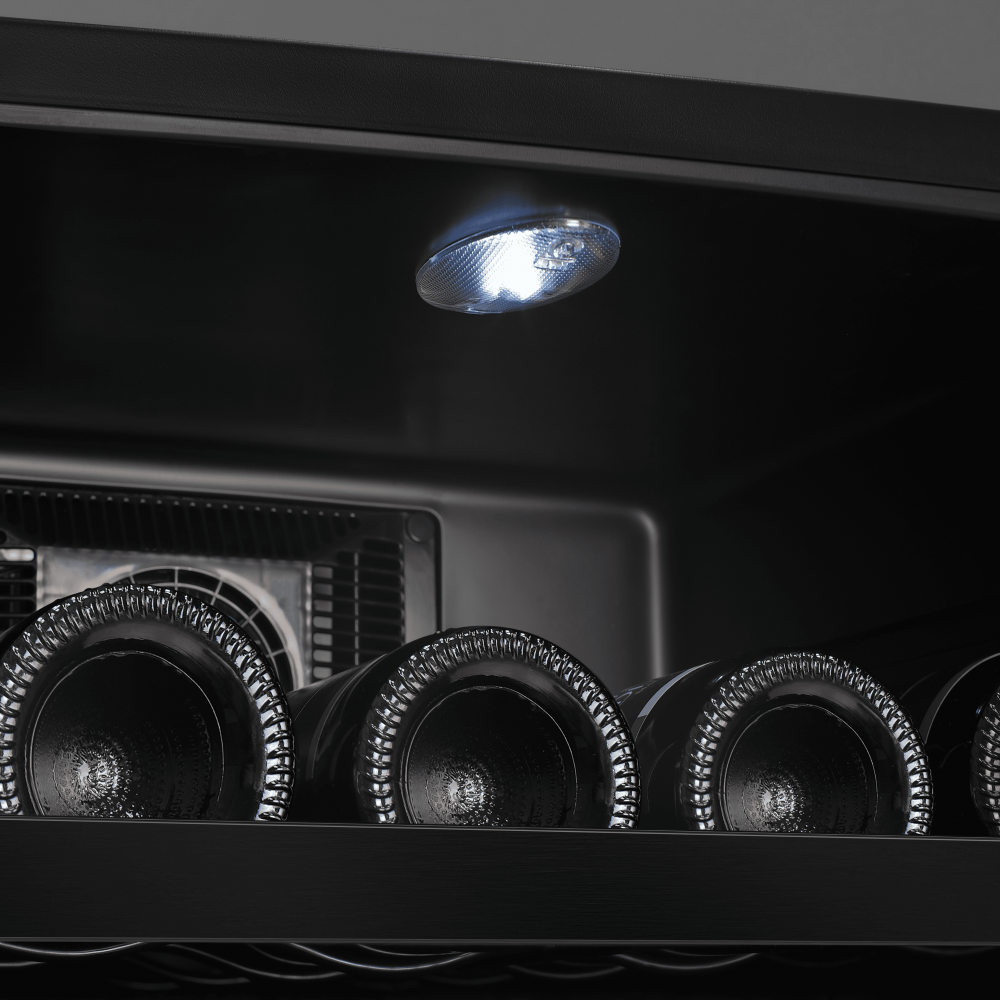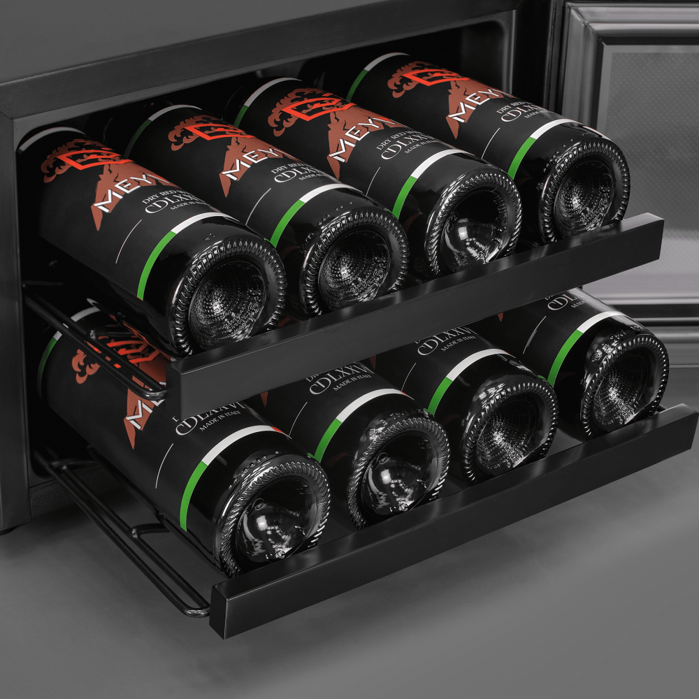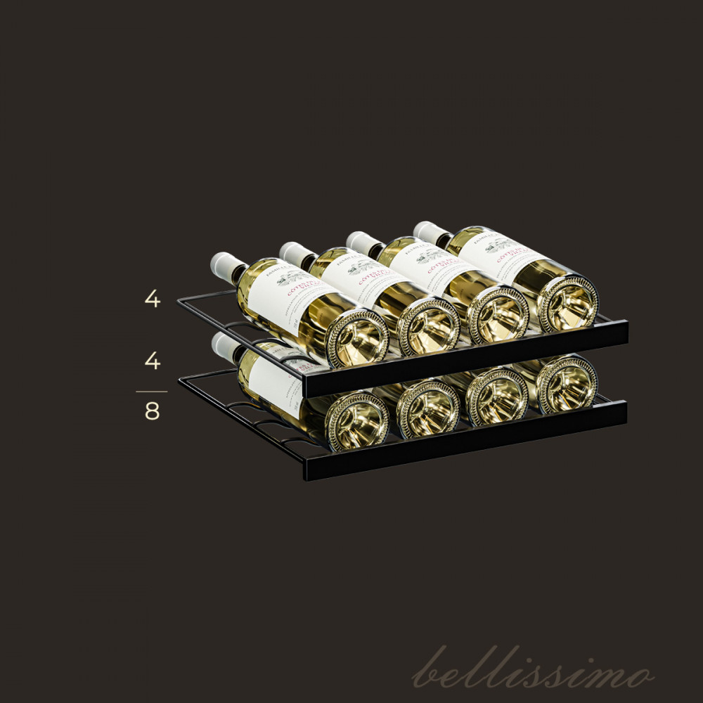 Двойное стекло с защитой от прямых УФ-лучей поддерживает качественные условия хранения вина. Для размещения винных бутылок, шкаф оснащен 2 полками из хромированного металла.