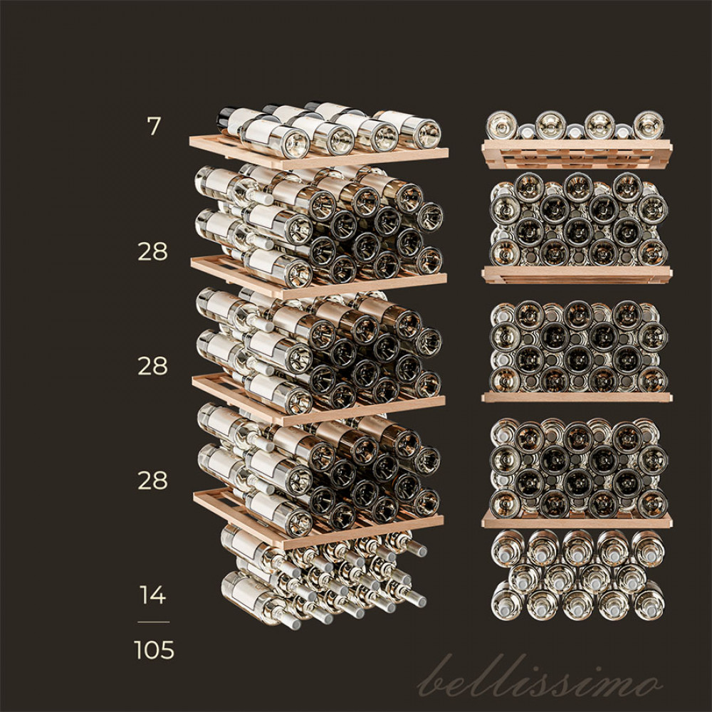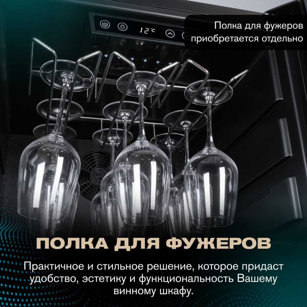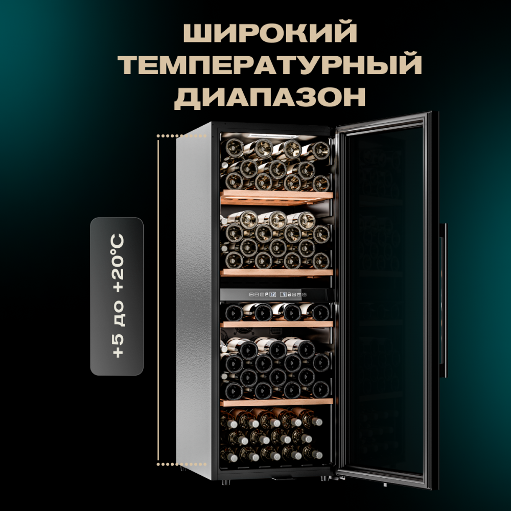 Модель оснащена четырьмя полками из дерева, что не только выглядит стильно, но и способствует правильной циркуляции воздуха внутри шкафа. Дополнительно можно установить до 6 полок, а также приобрести демонстрационную полку и полку для фужеров. Двойное стекло с УФ-фильтром надежно защищает вино от вредного воздействия света, что сохраняет его уникальный вкус и аромат.