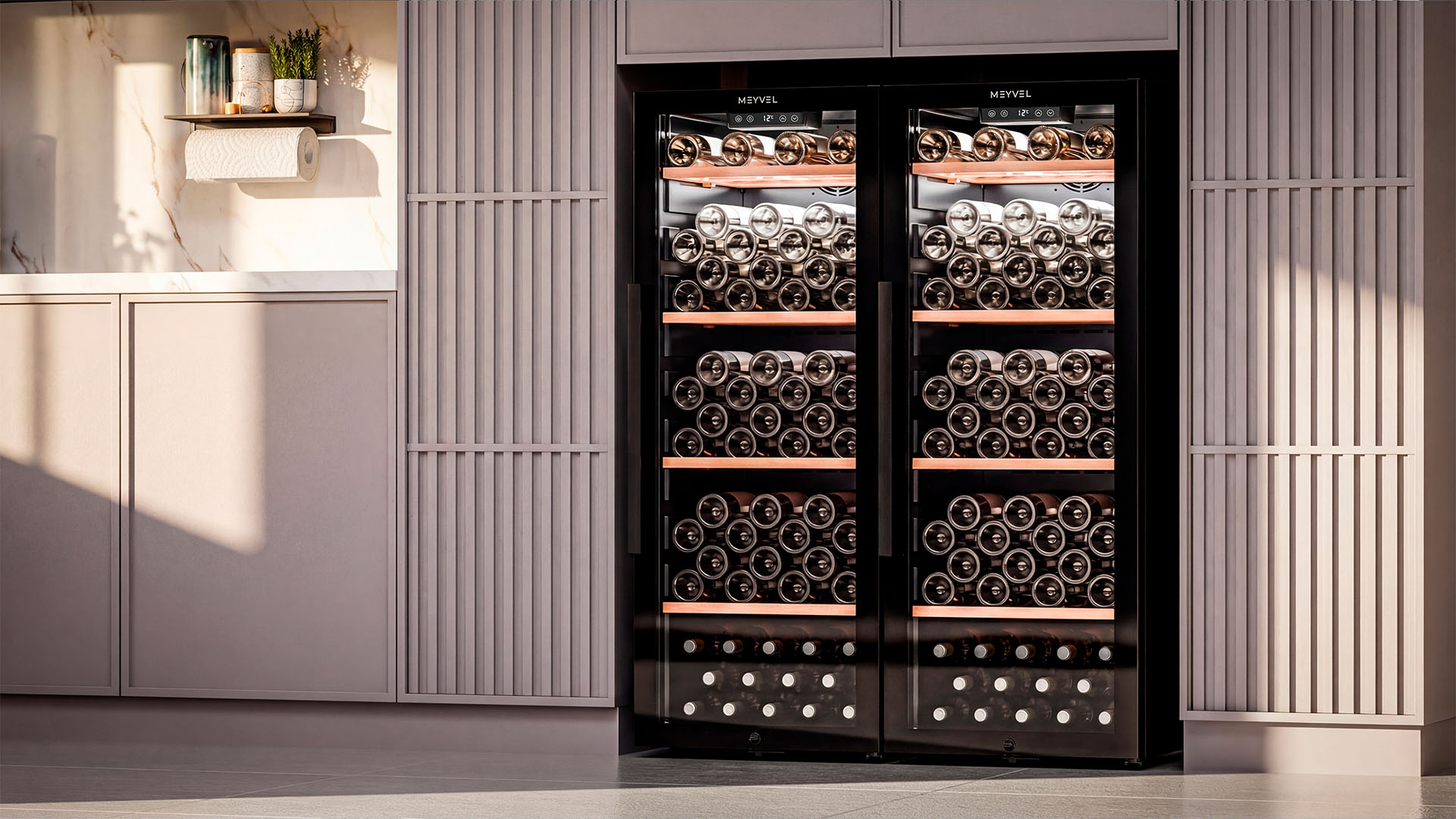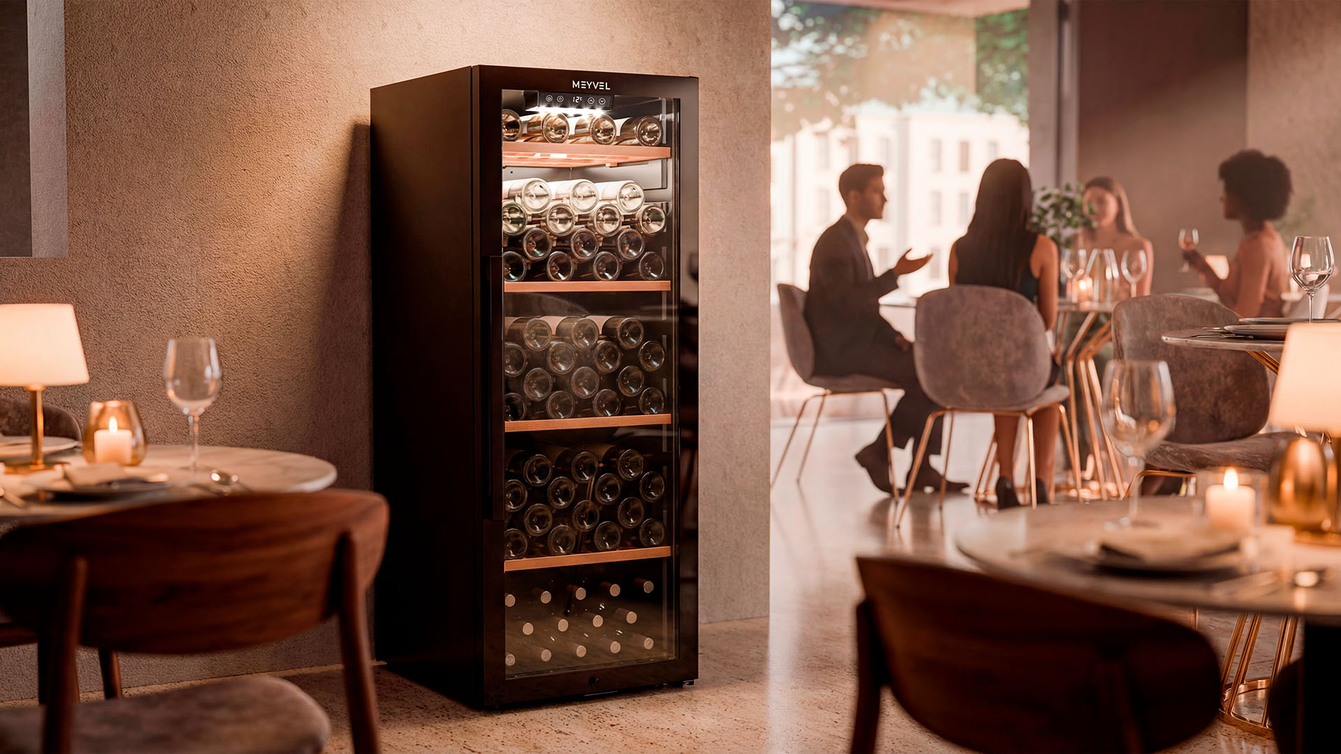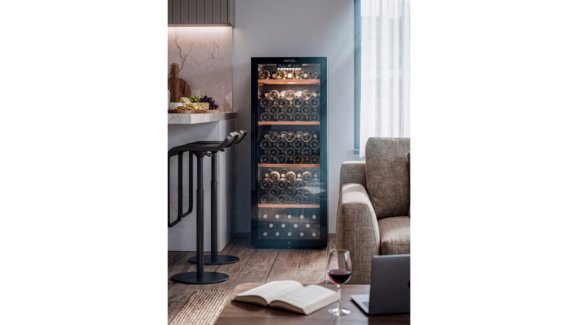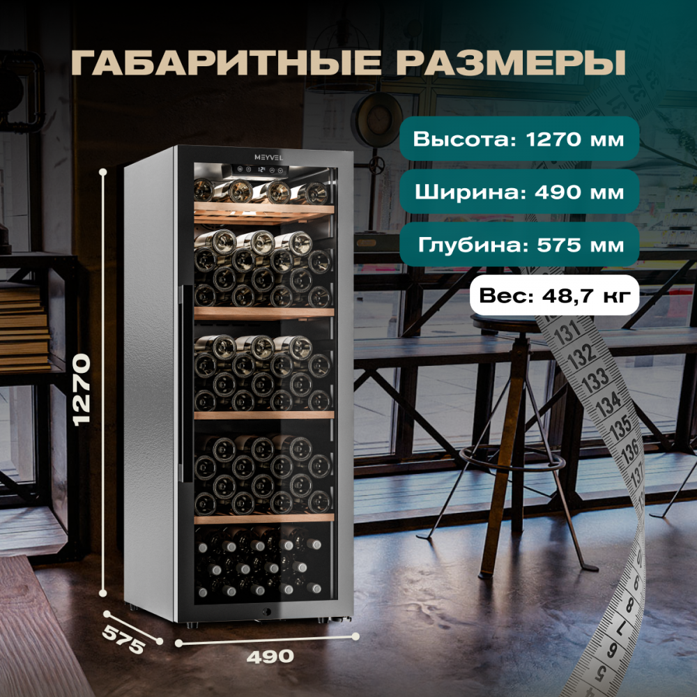 Meyvel MV105-KBF1 — отдельностоящее устройство, поэтому можно разместить его в любом удобном месте ресторана, отеля, бара или домашней винной комнаты без встраивания в мебель. Это удобно не только для создания стиля и атмосферы в интерьере, но и для предоставления легкого доступа к винам.