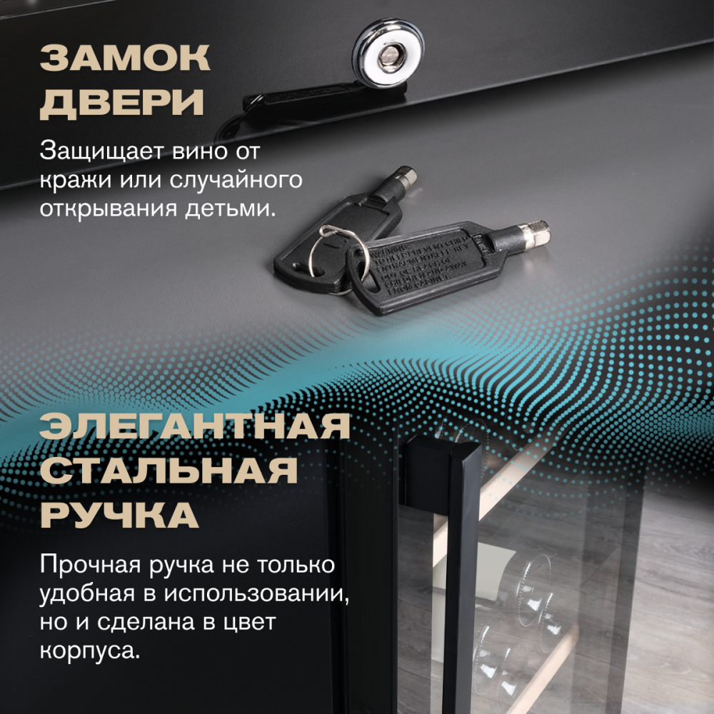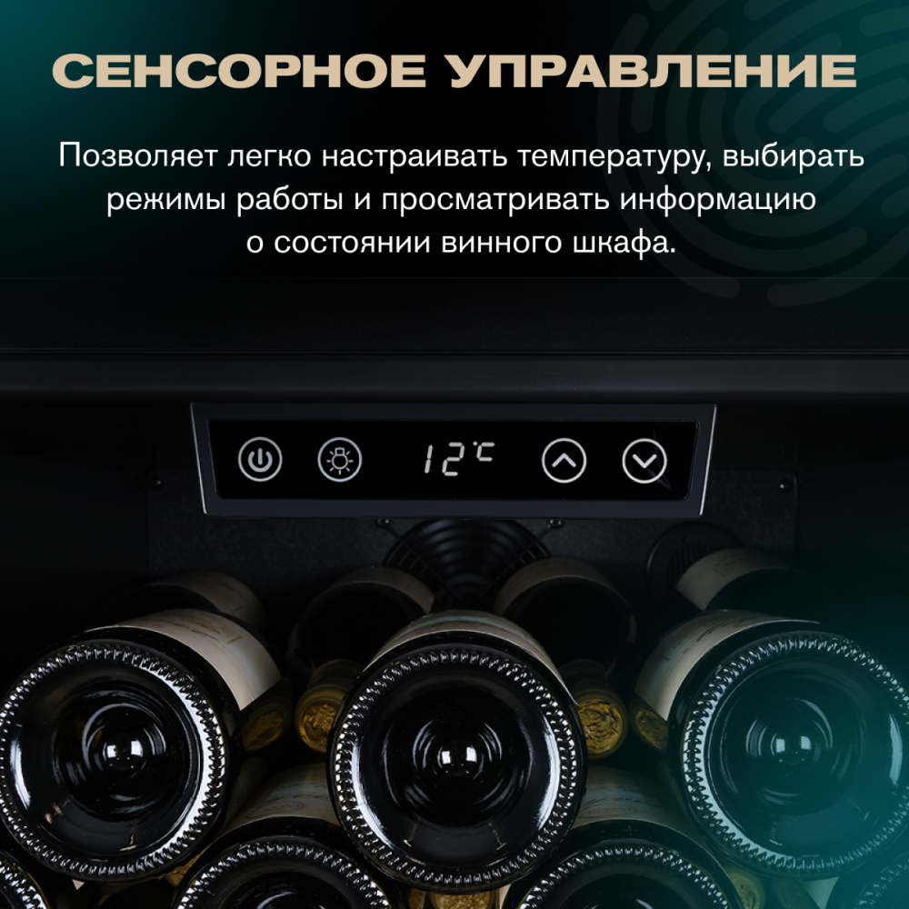 Управление осуществляется через сенсорную панель, а настройка интуитивно понятна. Также предусмотрены важные функции для защиты винотеки: замок на двери для безопасности, угольный фильтр, который очищает воздух внутри шкафа от посторонних запахов, сигнализация отклонения температуры, которая предупреждает о любых изменениях в условиях хранения, и блокировка панели управления, предотвращающая случайные изменения настроек.