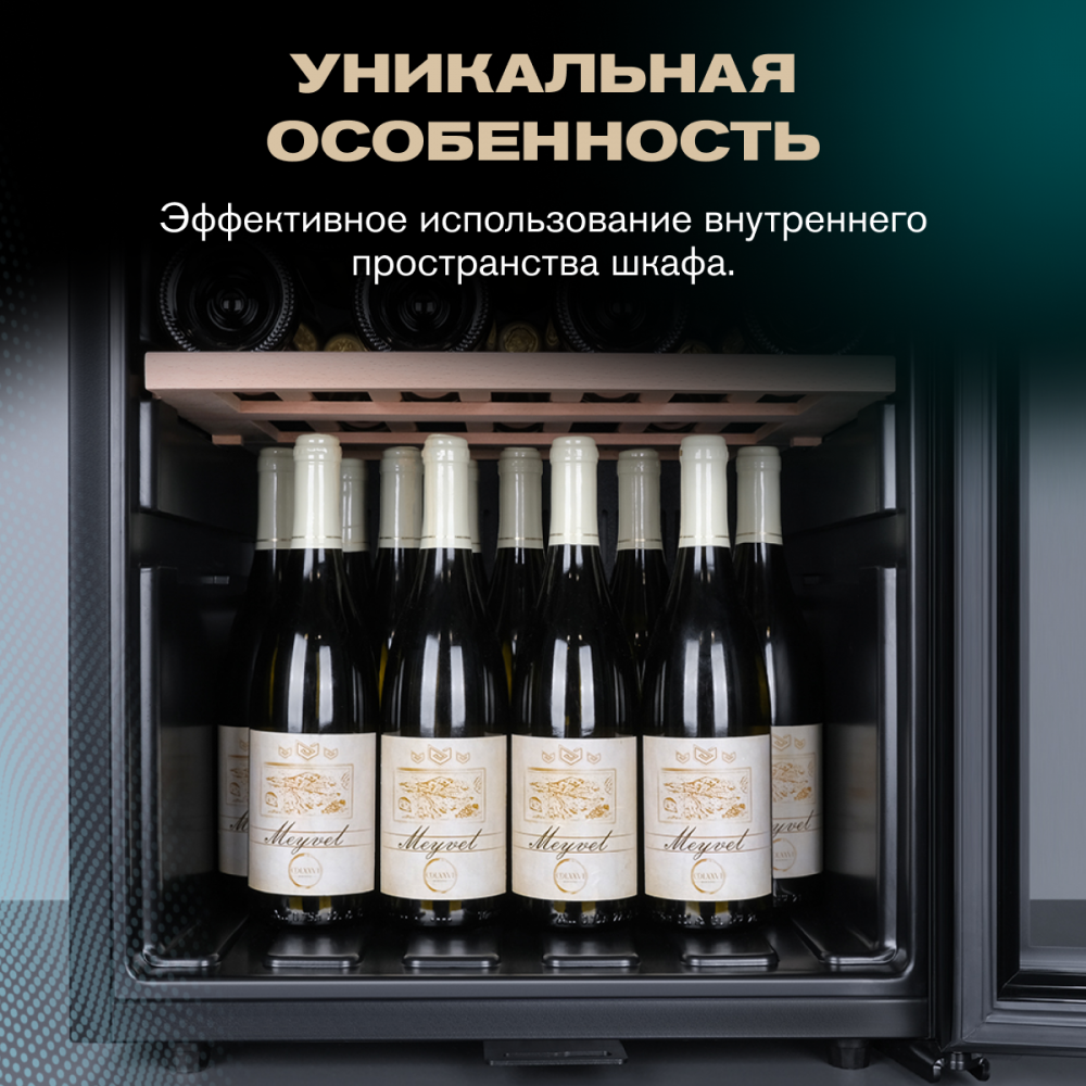 Винный шкаф работает очень тихо — уровень шума не превышает 38 дБ. Вы будете наслаждаться любимыми напитками без посторонних назойливых звуков.