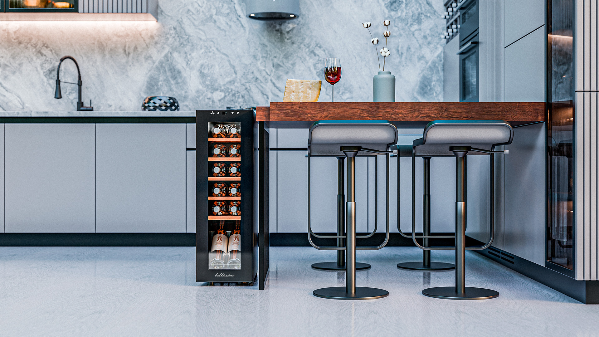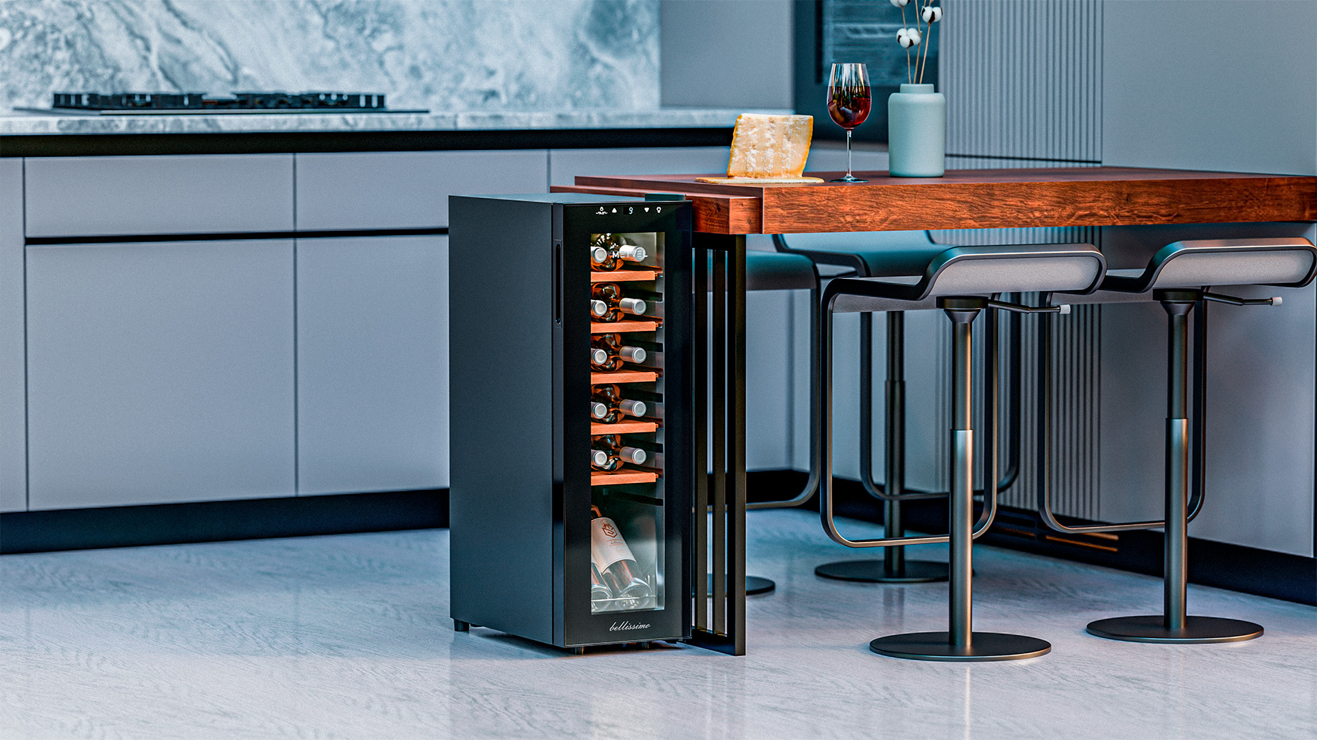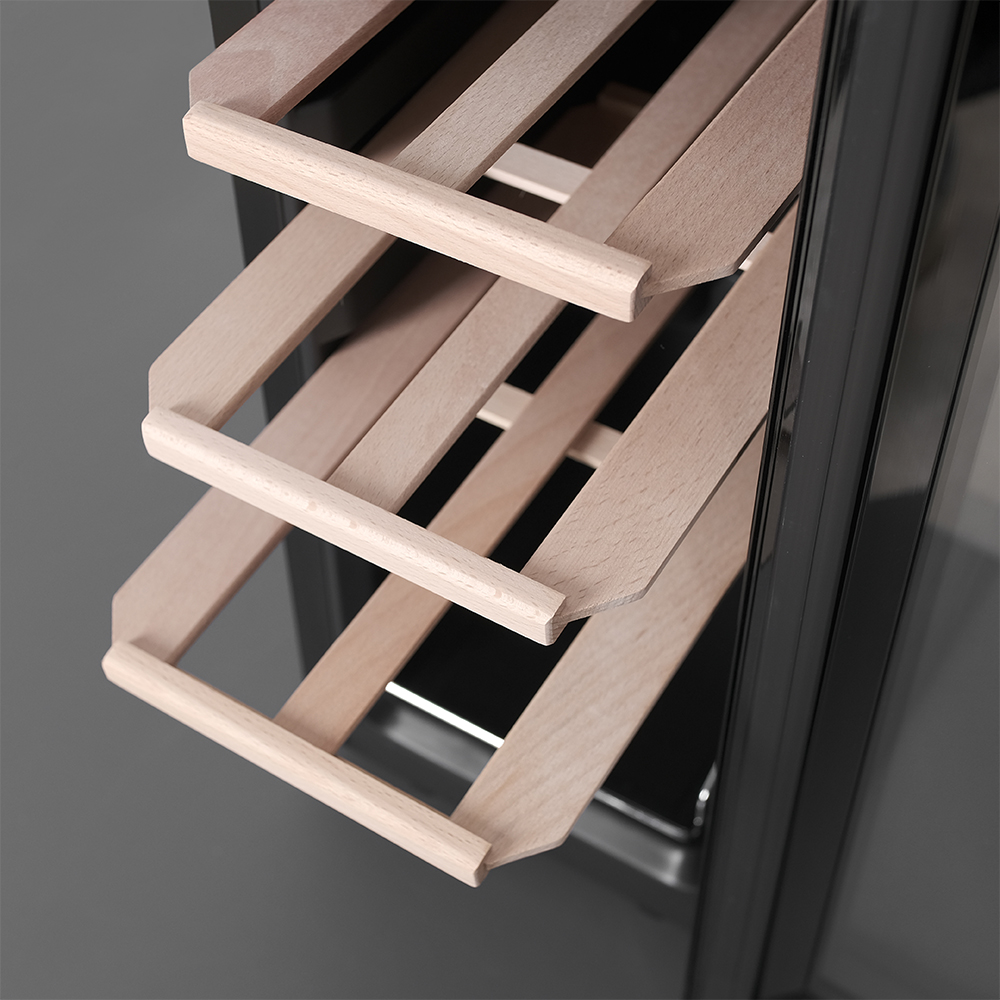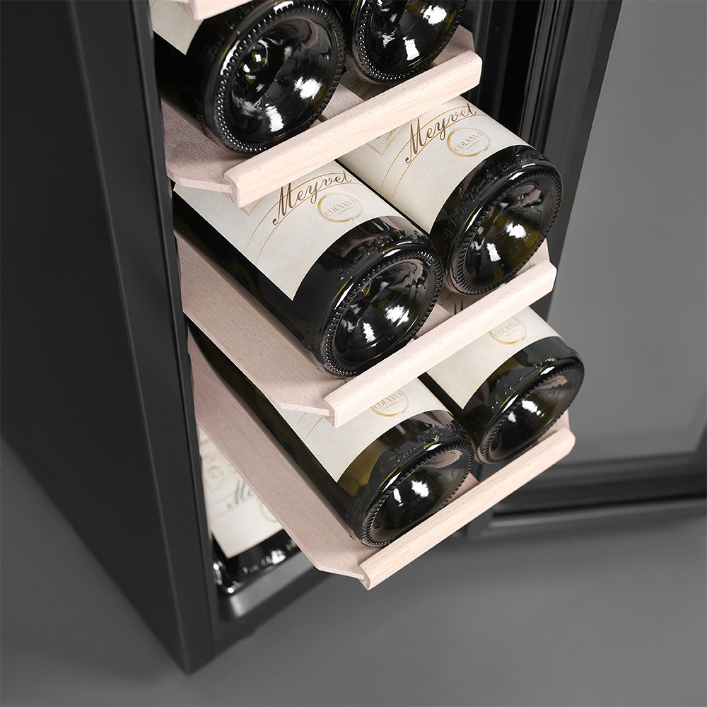 В винный шкаф помещается 12 бутылок, и это оптимальный объём для тех, кто только начинает собирать коллекцию или предпочитает держать под рукой небольшой, но тщательно отобранный набор вин. При этом устройство не выглядит громоздким и отлично вписывается даже в небольшие помещения.