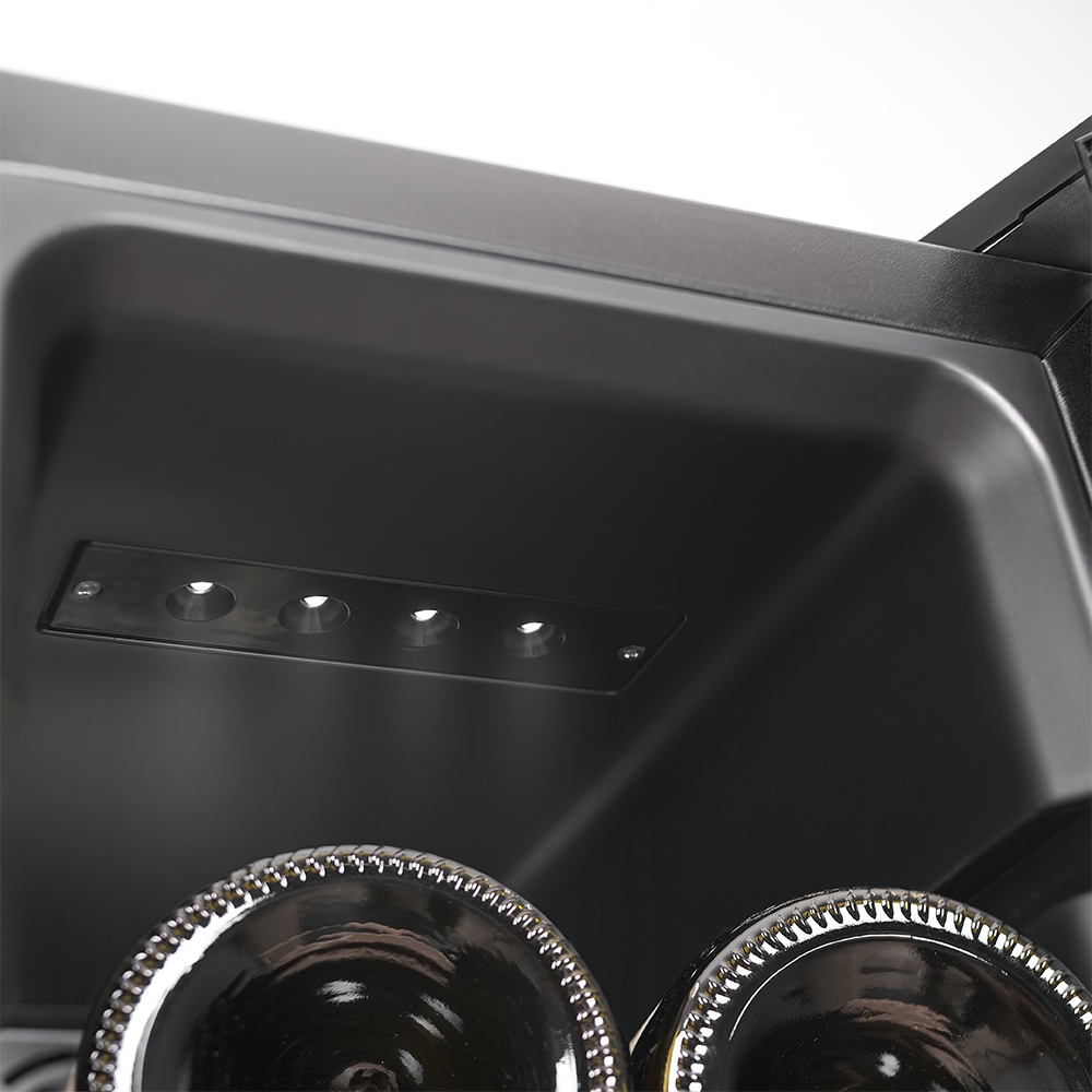 Для удобства предусмотрена светодиодная подсветка, которую можно включить кнопкой. Она мягко подсвечивает бутылки, создавая эффектный акцент и помогая легко найти нужное вино даже вечером.