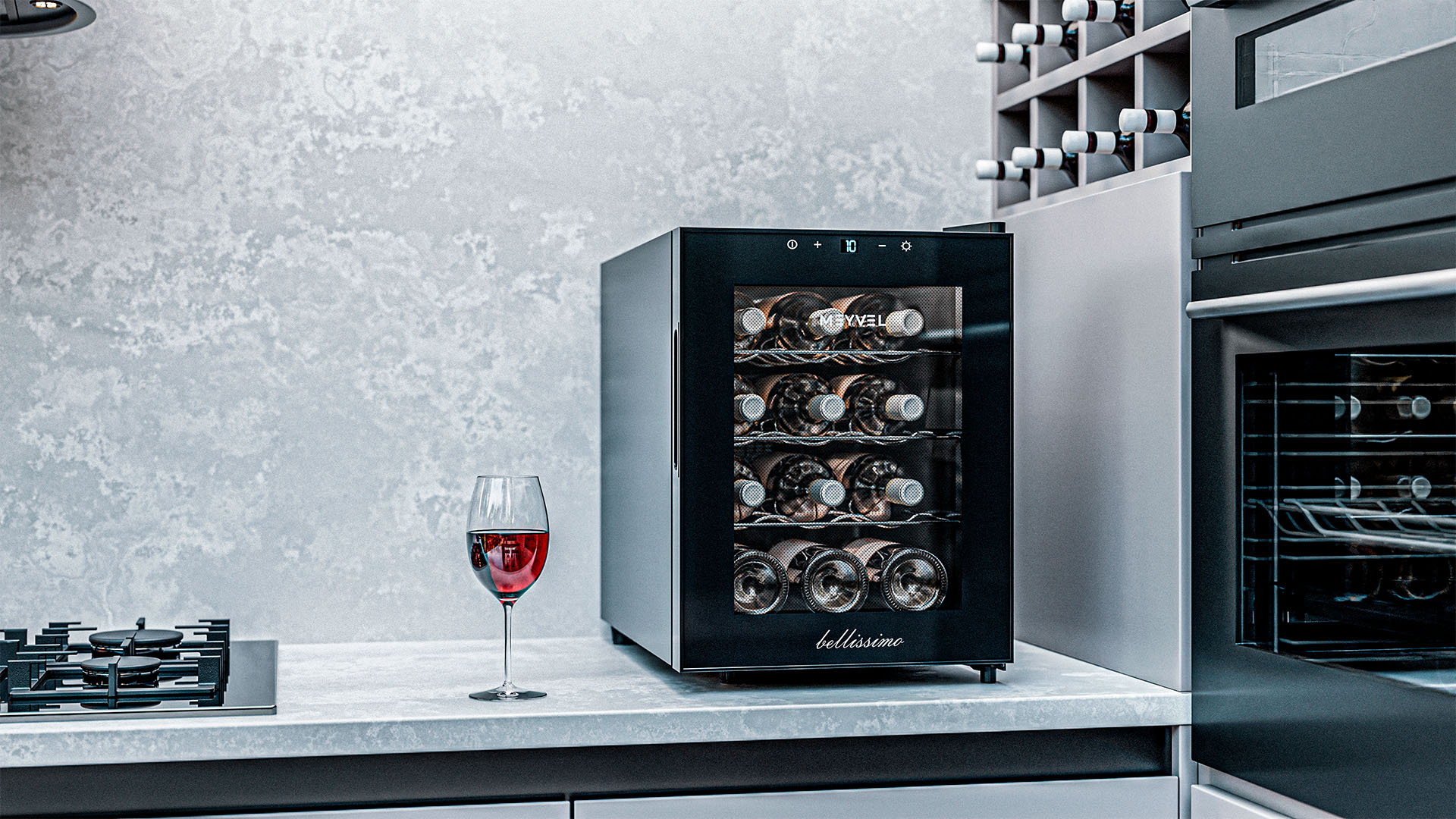Несмотря на компактность, внутреннее устройство продумано до мелочей. Три металлические полки рассчитаны на стандартные бутылки «Бордо», а мягкая подсветка включается и выключается кнопкой, поэтому нужная бутылка найдётся даже вечером.