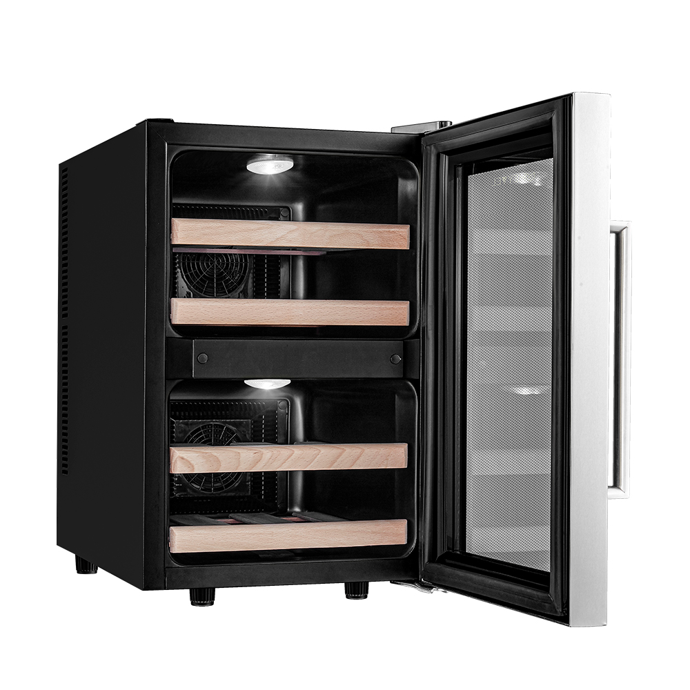 Термоэлектрический винный шкаф Meyvel MV12-BF2 (удобный) (easy) обладает небольшой вместимостью и способен разместить в себе до 12 бутылок. Располагаются они на полках из массива бука. Внутреннее пространство шкафа разделено на 2 температурные зоны с возможностью настраивать каждую из них в диапазоне от +7 °C до +18 °C. Холодильник поддерживает влажность в диапазоне 50-80%, как в настоящем винном погребе.