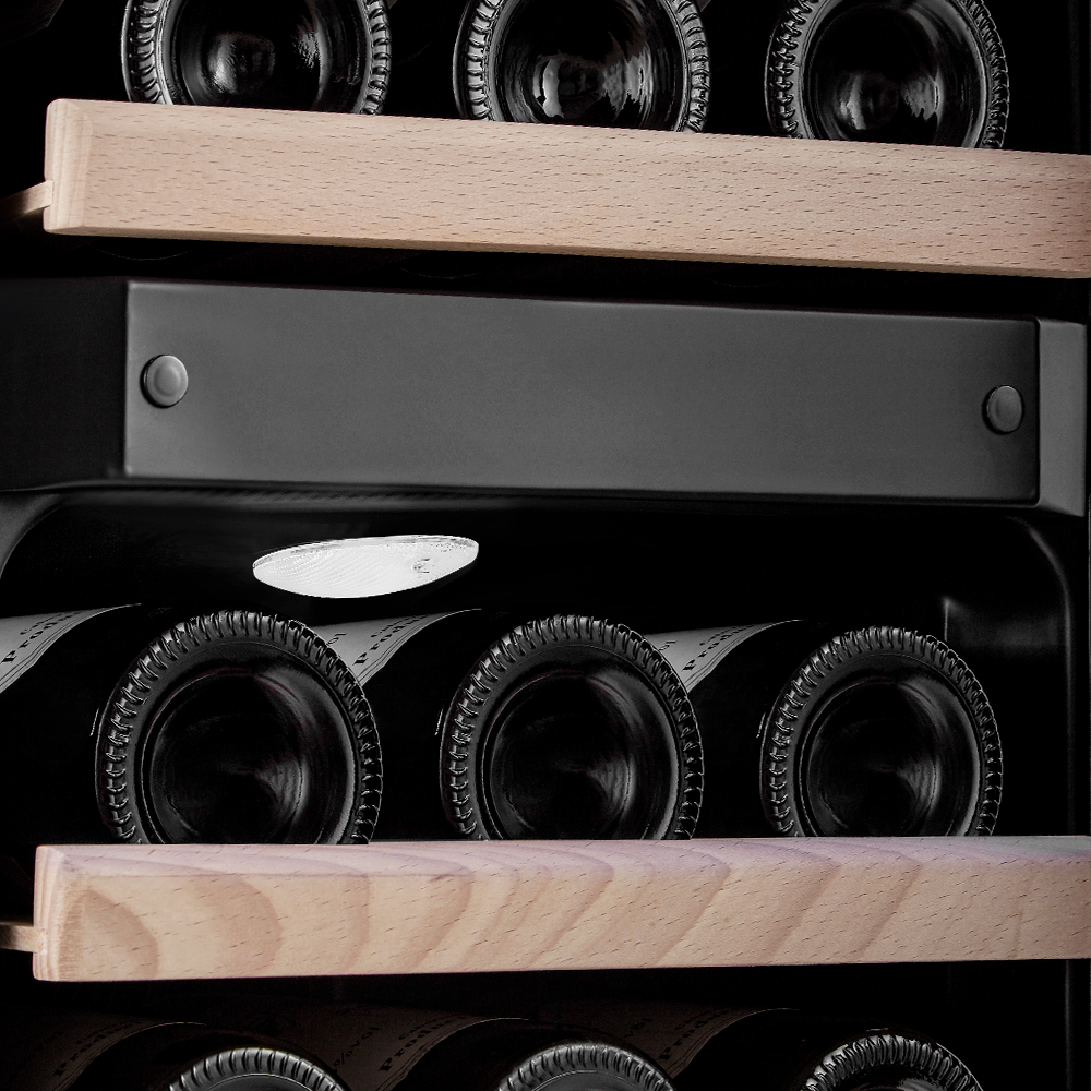 Двойное стекло с защитой от прямых УФ-лучей поддерживает качественные условия хранения вина. Для размещения винных бутылок, шкаф оснащен 4 крепкими полками из массива бука.