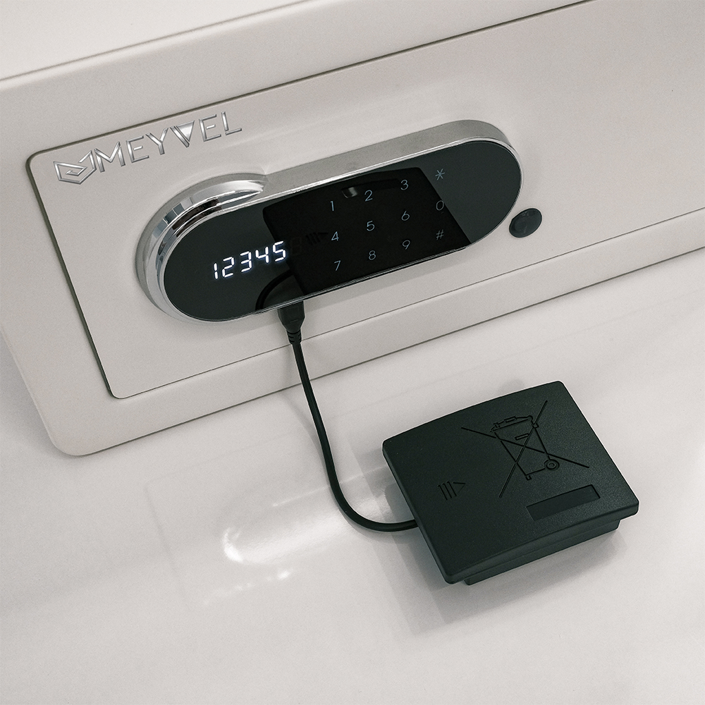 В случае, если установленные в сейфе батарейки разрядились и Вы не успели их заменить — на лицевой панели сейфа есть USB-разъём для подключения внешнего блока электропитания. Нужно подключить этот блок и открыть сейф пользовательским или мастер кодом.