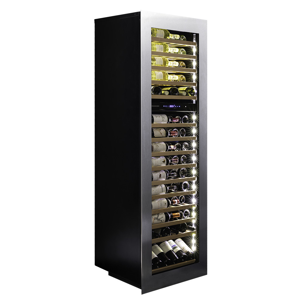 Лаконичный дизайн шкафа придаёт интерьеру современный вид. Чёрный корпус и рамка из бесшовной нержавеющей стали добавляют элегантности и солидности. В этой модели использовано панорамное освещение синего, янтарного и белого цвета, которое обеспечивает равномерную подсветку всех полок. (Освещение плавно включается при открывании дверцы, а через пару секунд после закрытия плавно гаснет.) Дополнительно у данной модели шкафа предусмотрен демонстрационный режим, во время которого освещение не гаснет. Такая функция помогает демонстрировать винную коллекцию Вашим друзьям и близким. Ещё один интересный режим работы - «Эко-демо». При нём винный шкаф не охлаждает, но подсветка работает. Так же используется для демонстрации.