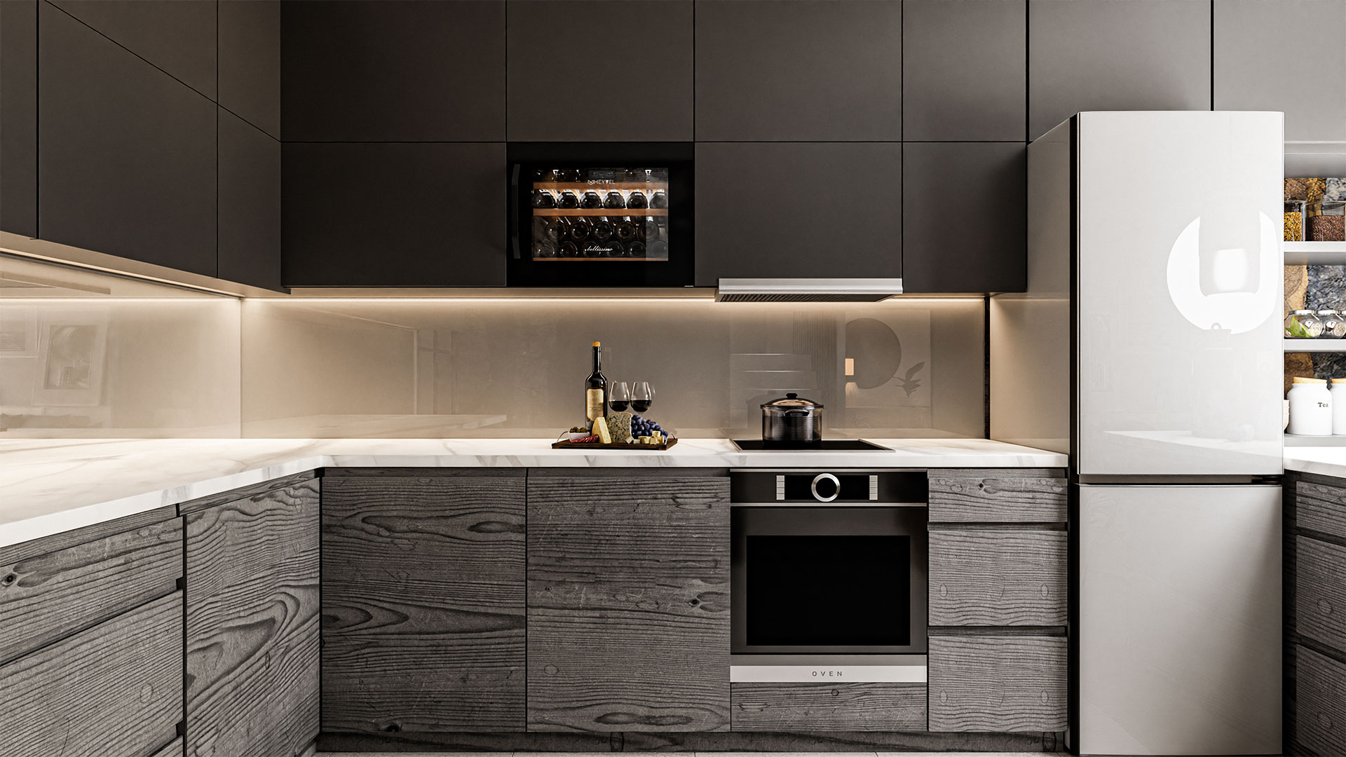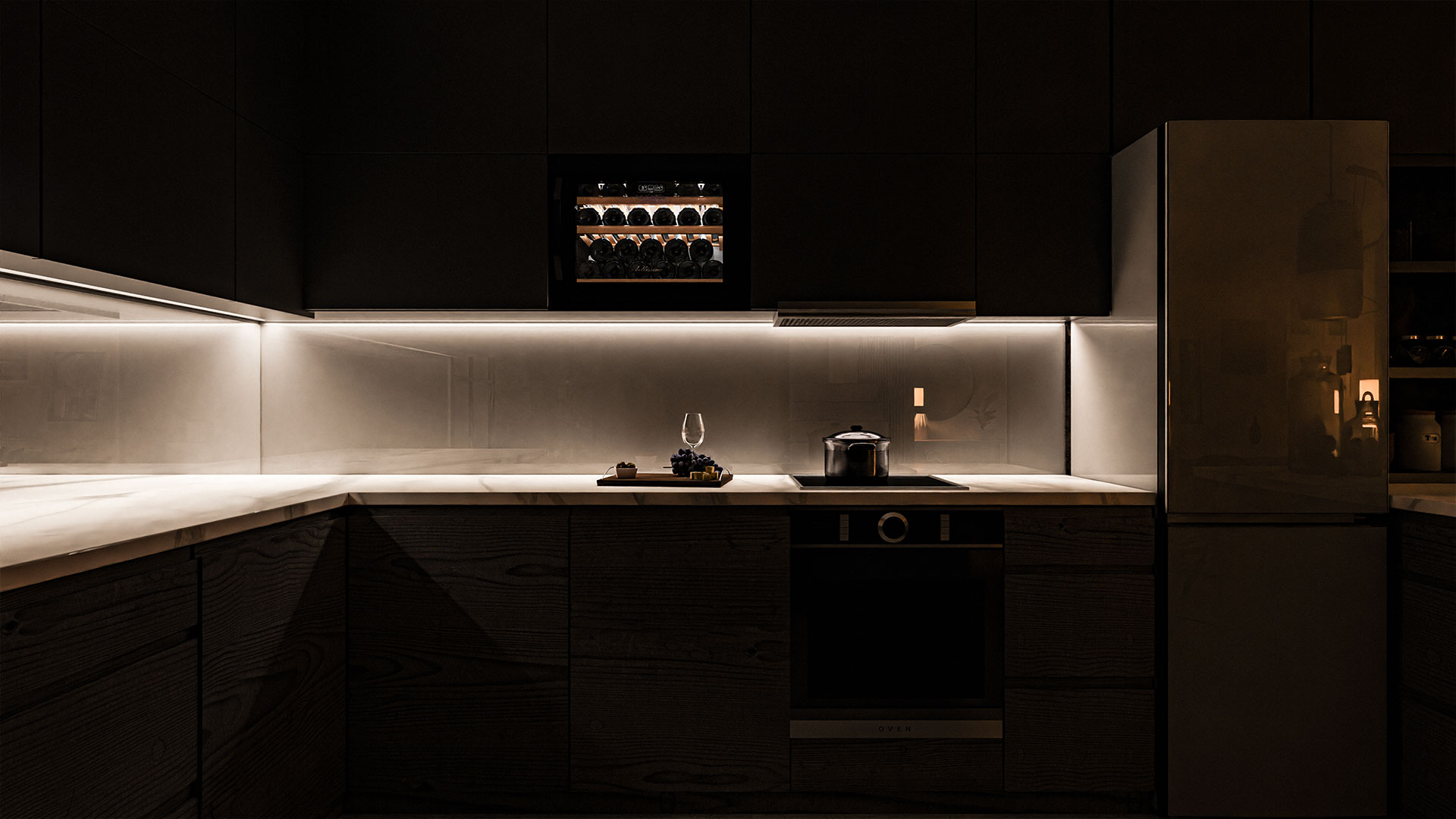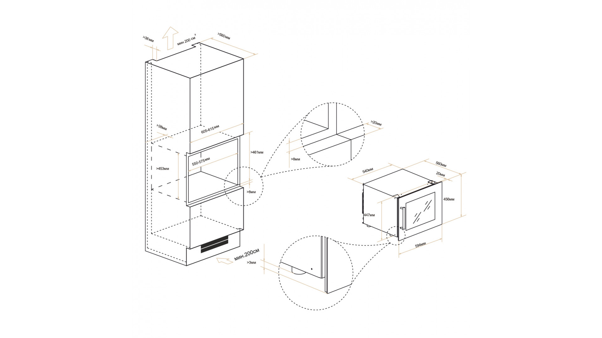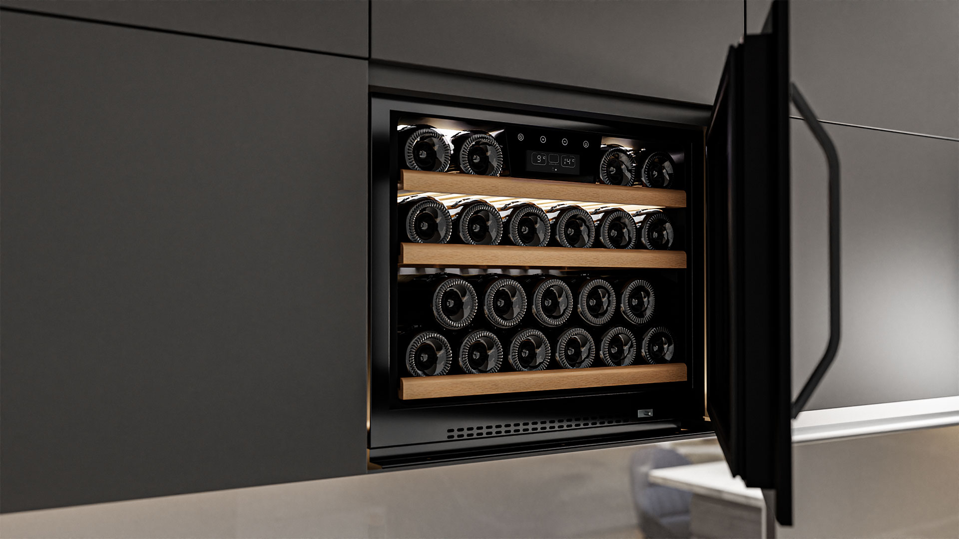 - необходимо установить винный шкаф по уровню и отрегулировать зазоры между дверью и мебельными фасадами, чтобы не повредить их.